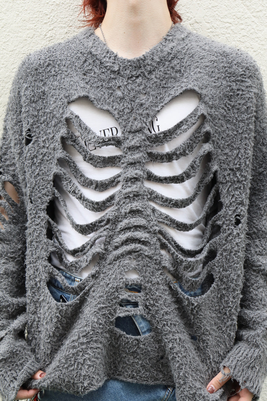 まるで肌の下から肋骨が浮かび上がるような不気味さを持った個性的なニット。