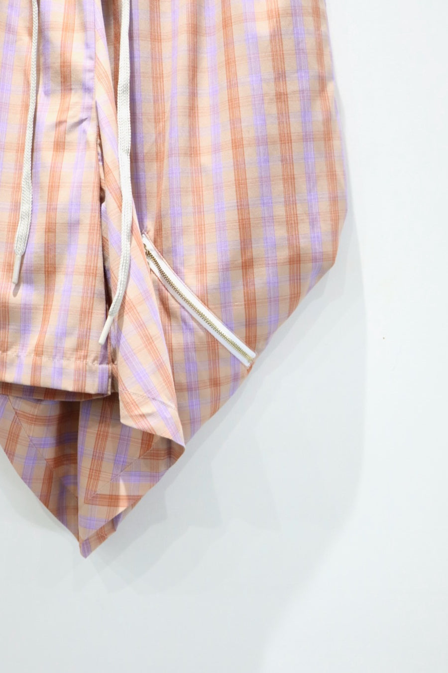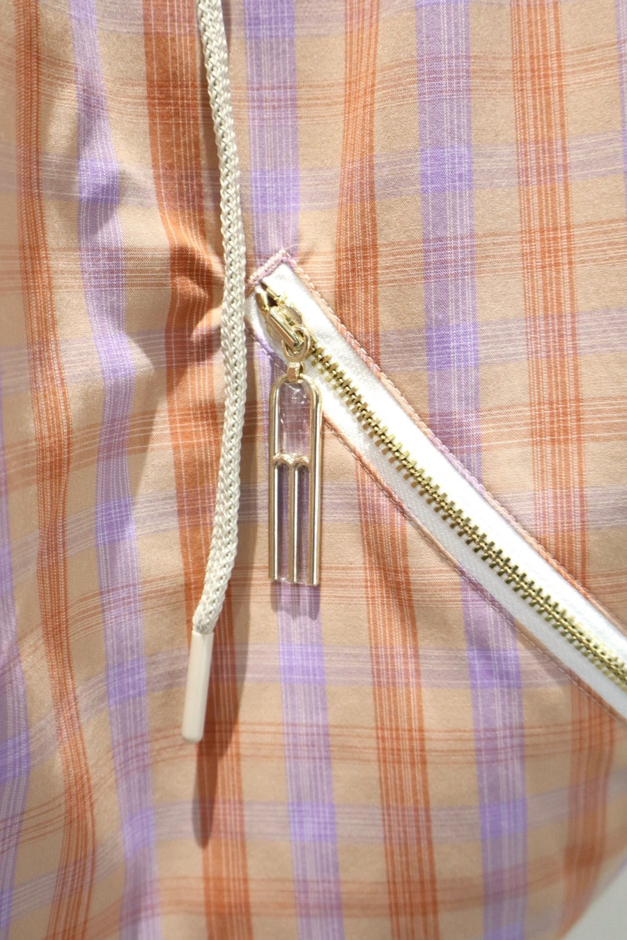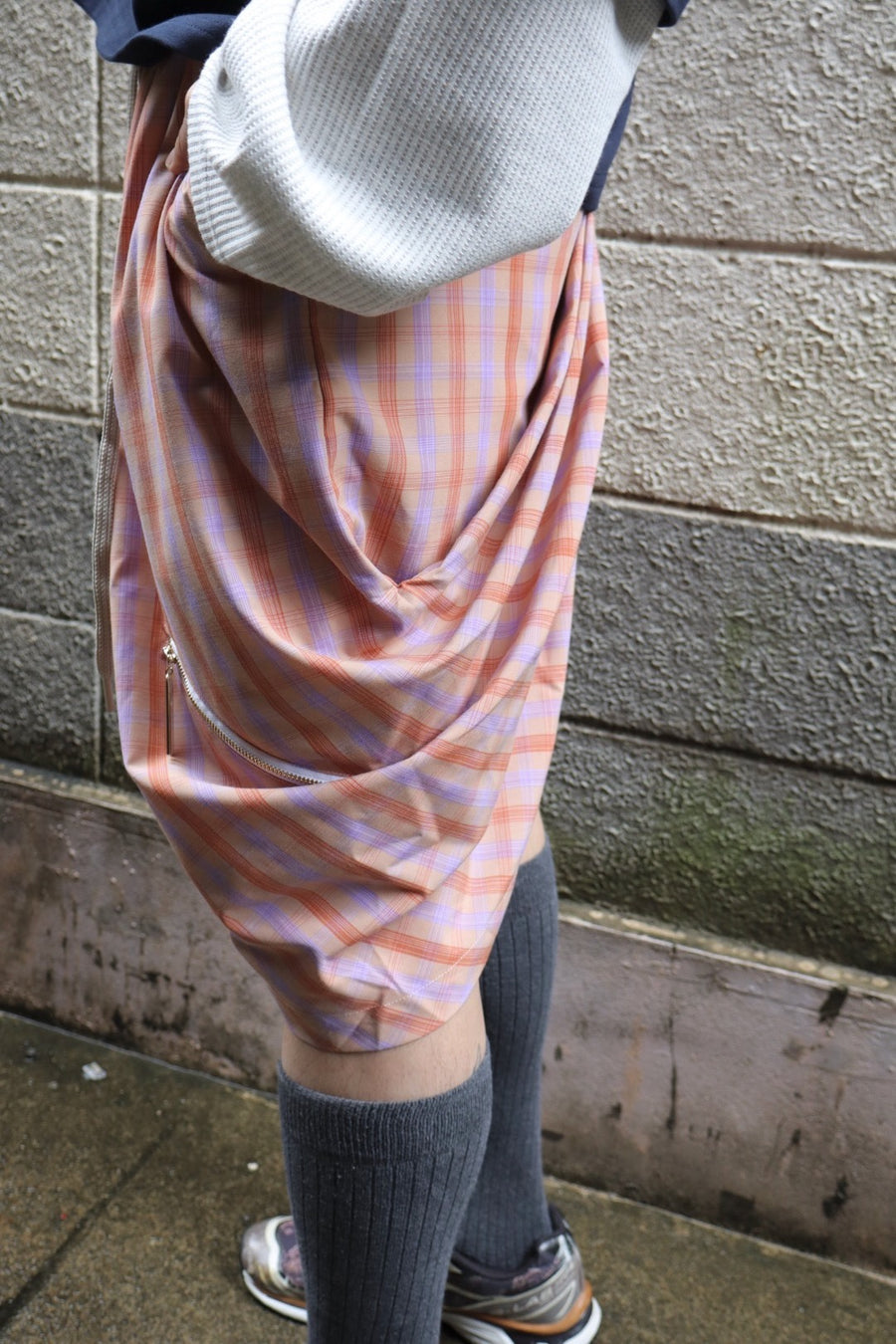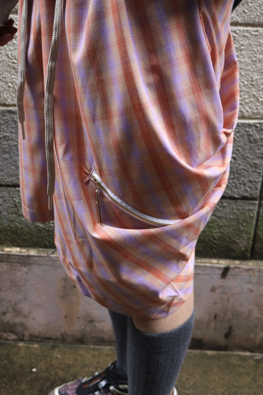 The opening is asymmetrical, and the plaid pattern is an accent.