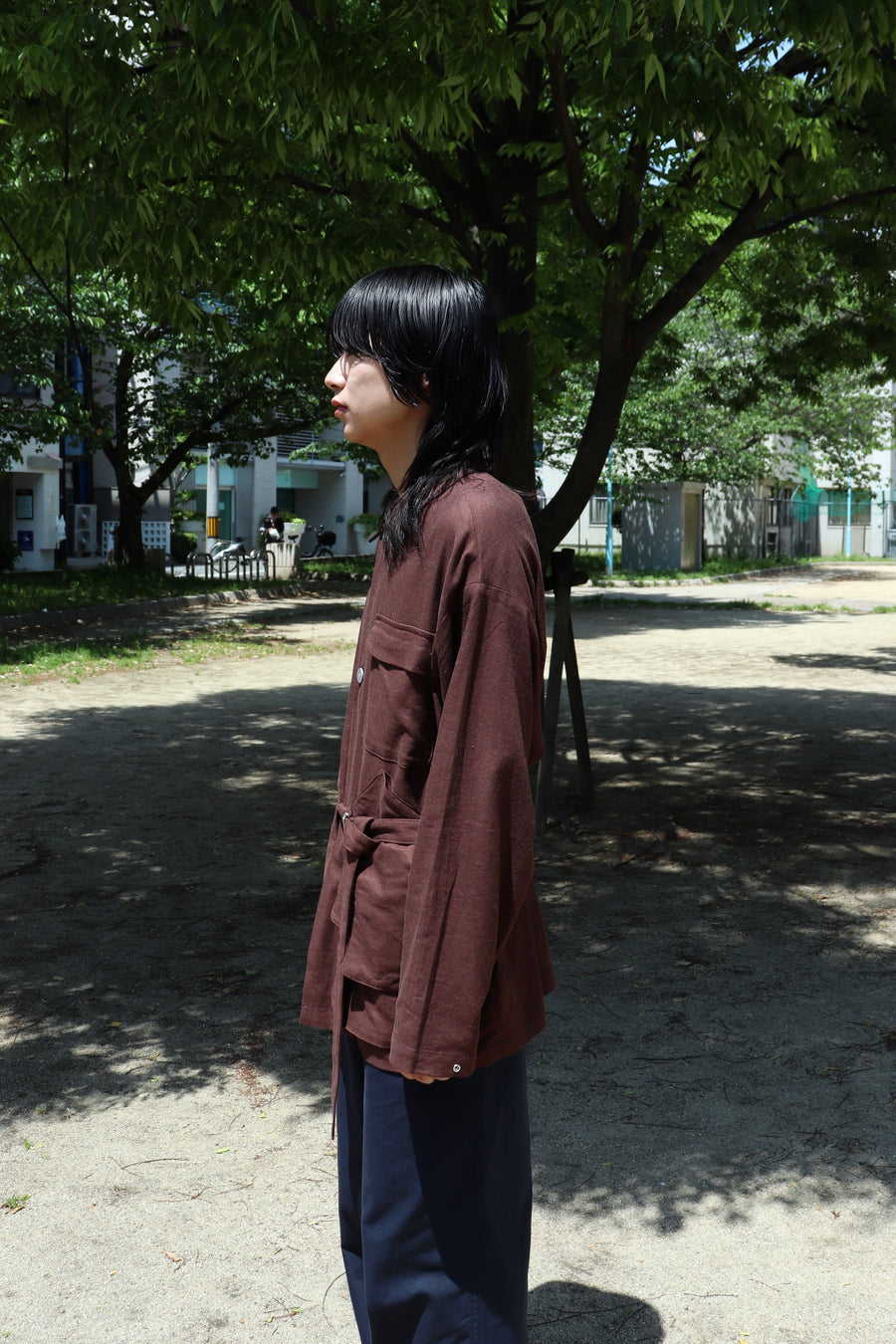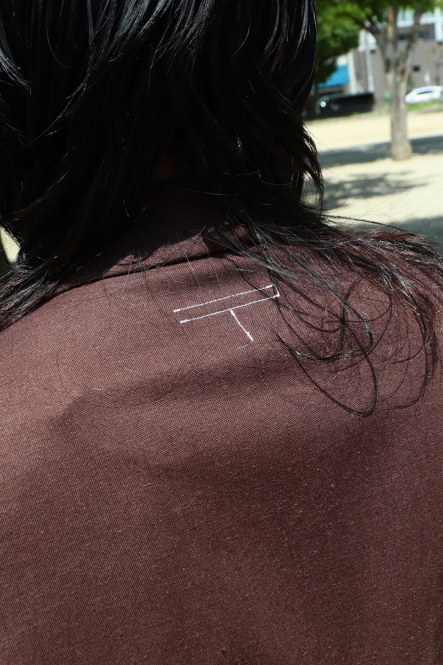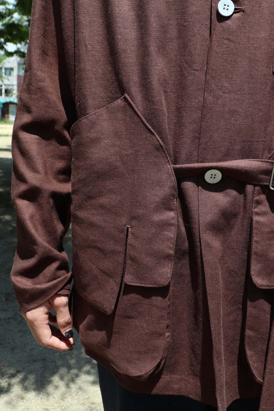 이 작품은 가공 된 알루미늄 버튼 및 허리 벨트와 같은 세부 사항에 중점을 둡니다.
