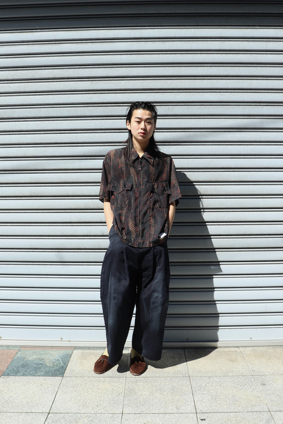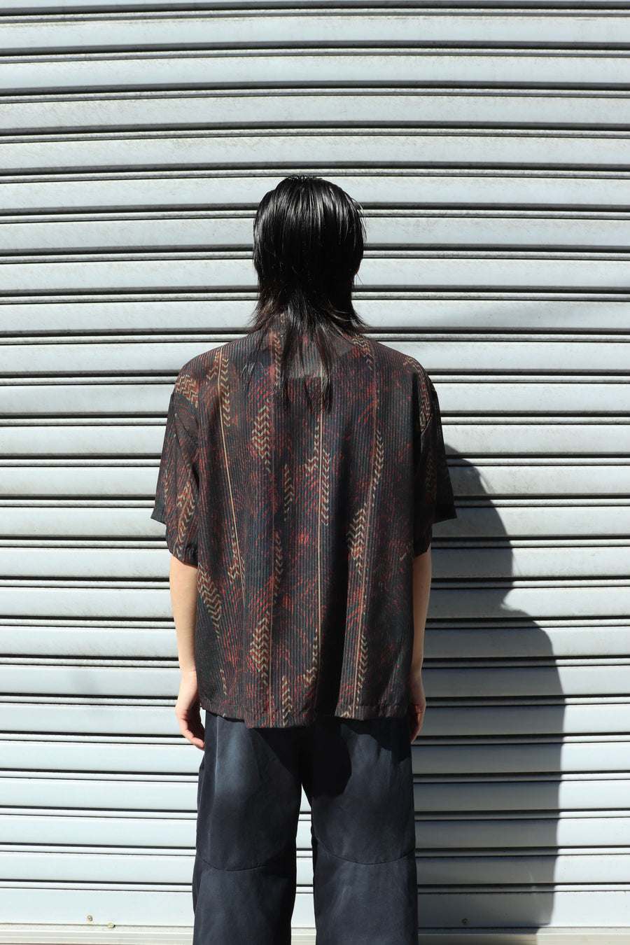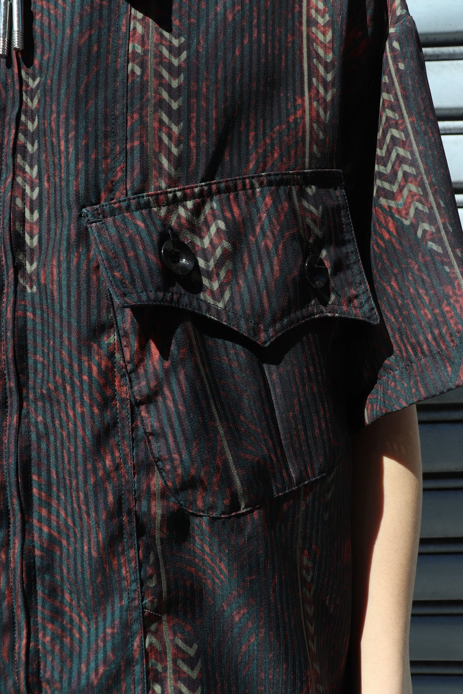 根をイメージしたオリジナルテキスタイルを使用した透け感のあるジップシャツ。