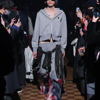 厳格なジャケットのパターンとベルベット素材の高貴なイメージと、カジュアルウェアの代表とも言えるスウェットパンツがドッキングされたデザインは今シーズンのテーマである"marriage"を存分に表現している。