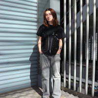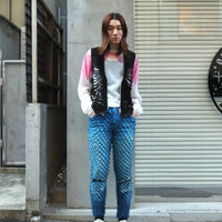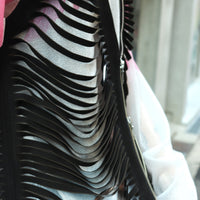 まるでシュレッダーを通したかのように全身に入る切り込みには"本当に必要なもの"を問いかける意が込められている。