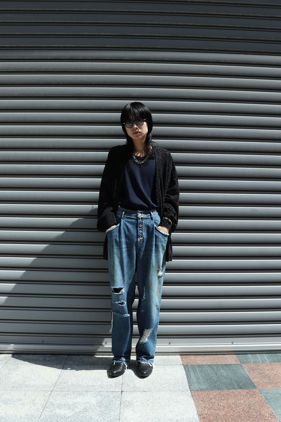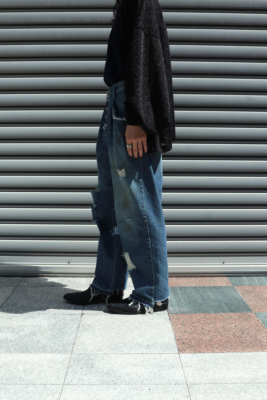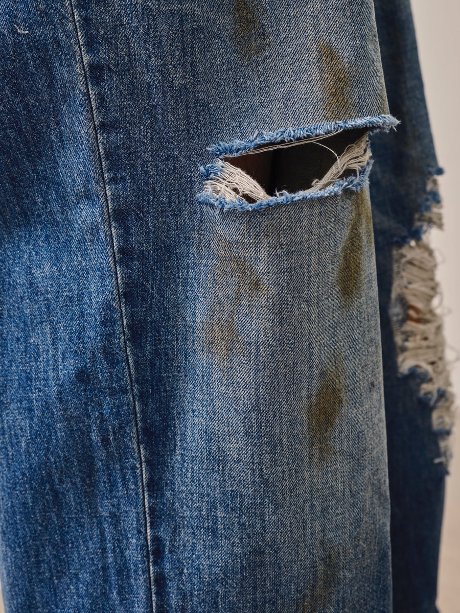 過去のコレクションから踏襲したオイル加工とデザイナー自らの手でダメージ加工を施したデニム。